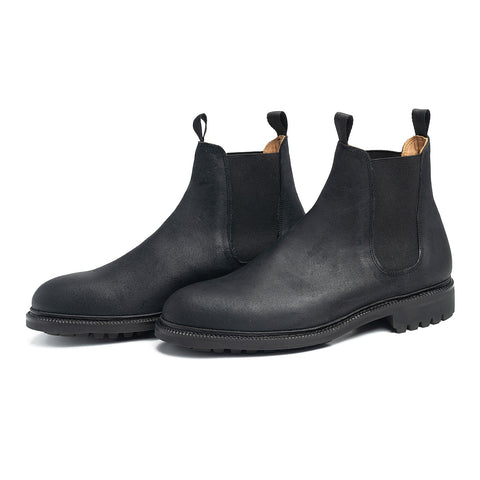 Introducing our newest version of our casual wholecut chelsea boot. A design updated, featuring our very own Ultraflex System construction welted on the comfortbale ROD last, fitted with storm welts, thick leather midsoles and thicker soles, making a robust and truly unique boot. This new range is made using unique casual leathers from world renowned tanneries, for this specific version we've the resilient Waxy Commander leather in black finished with a robust Commando rubber sole.
